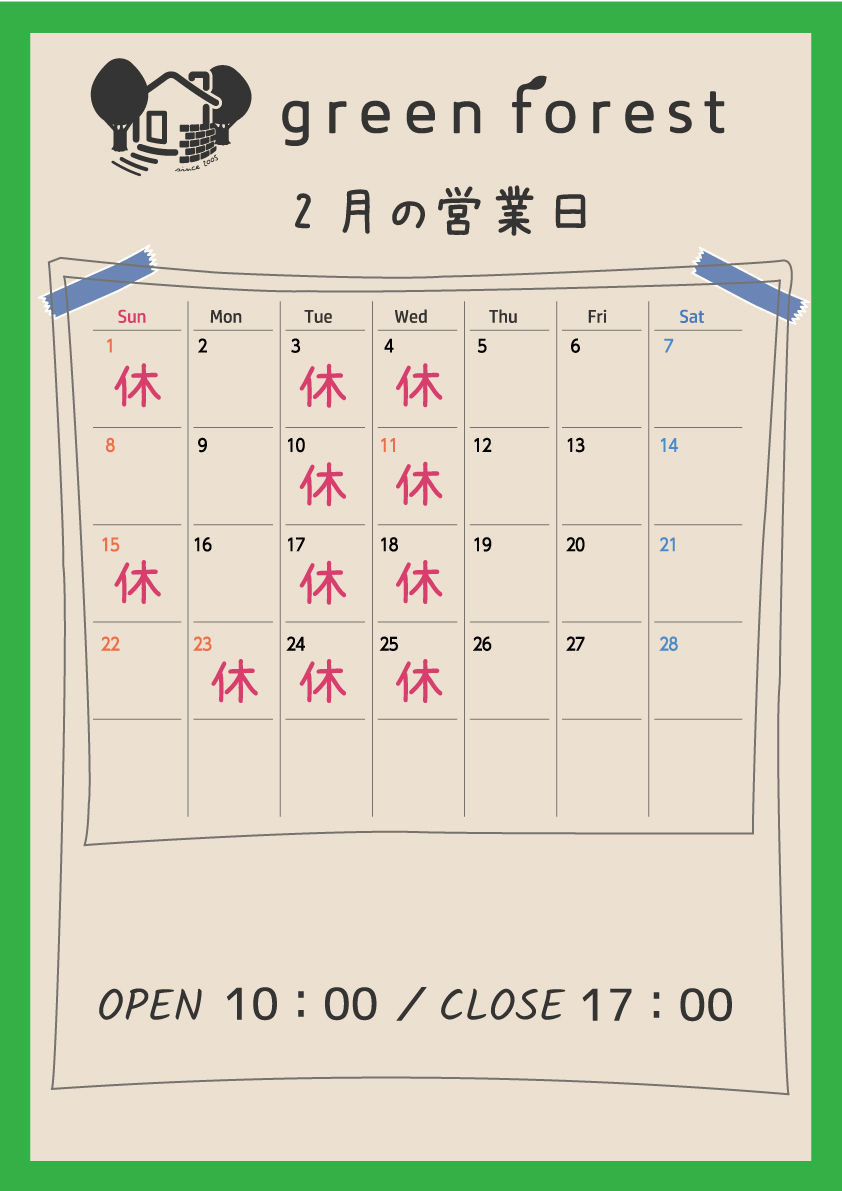 冬期間の営業日 2026.1.26 -[お知らせ] 弊社の冬期間の定休日は、火曜日、水曜日、第1、第3日曜日、祝日となっております。 営業時間は10時から17時です。お休みが多く申し訳ございませんが、お電話はその時間内でお願いいたします。 除排雪サービスご利用のお客様におかれましては、LINEに関しては、ある程度時間外でも対応できますし、お写真を送っていただけると、やり取りもスムーズです。割引もございますので、可能でしたらそちらのご利用をお願いします。