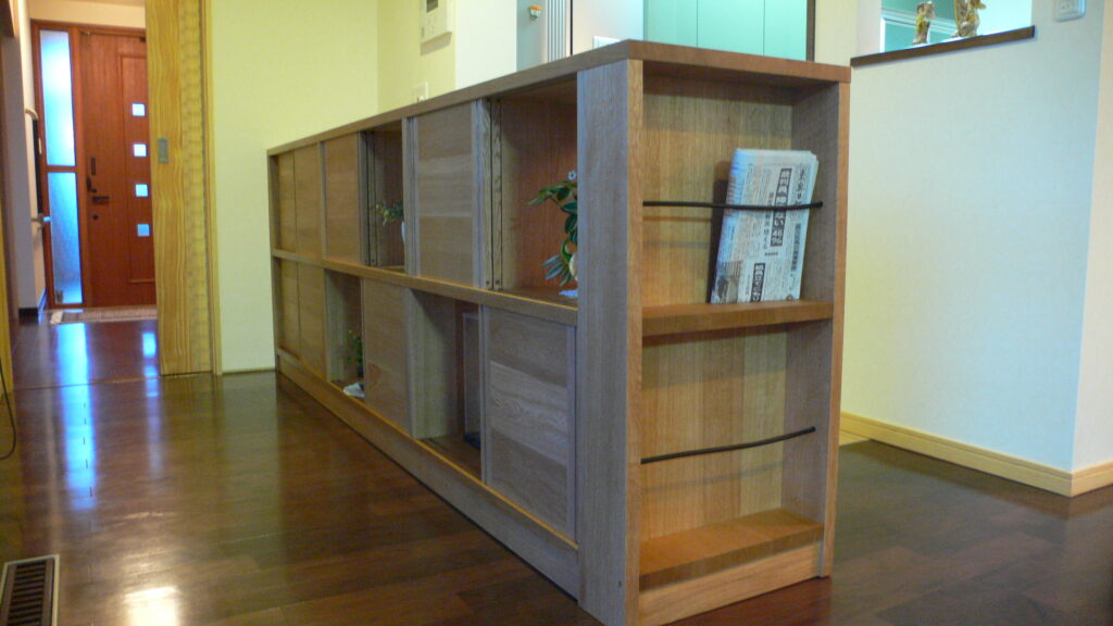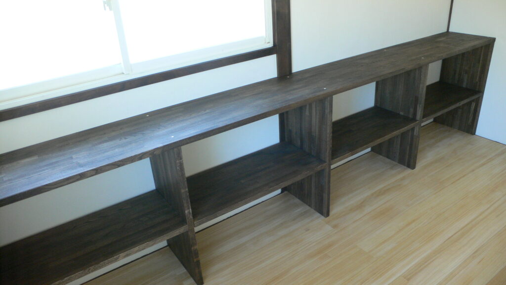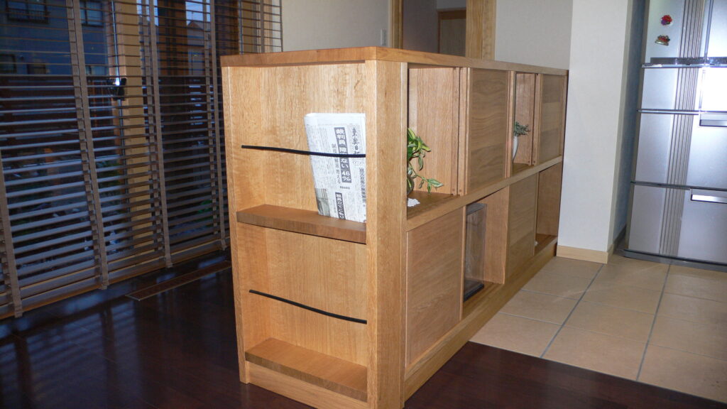 ナラの無垢材を使って、大鰐の家具屋、わにもっこさんに作っていただきました。