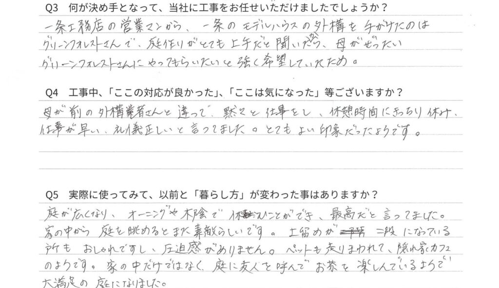 この度は、当社を選んでいただきましてありがとうございます。訪れるたびに職人のことをお褒めいただきまして、また、いつも温かい差し入れをいただきまして、社員一同感謝しております。お庭の崖の部分が圧迫感無くなったとの事で、皆様が集えるスペースが作れて良かったです。