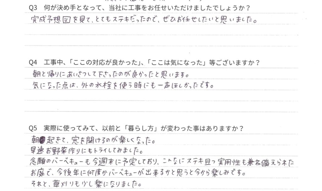 この度は、プランを気に入られて、当社を選んでいただきまして、ありがとうございます。外の水栓を使うときのお声がけ、本当に申し訳ございませんでした。今後、より良い施工チームを作れるように改善いたします。広いお庭で、今まで管理も大変だったかと思うのですが、これを機に楽になり、お庭に出る回数が増えたようで嬉しく思っております。