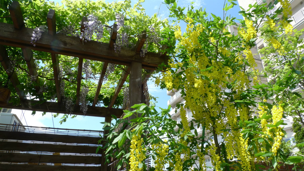 2011 06 06_2656藤棚のフジとキングサリの競演です。