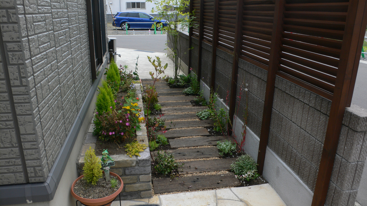 レンガの花壇と、既存ブロックの間に枕木を敷き詰め、